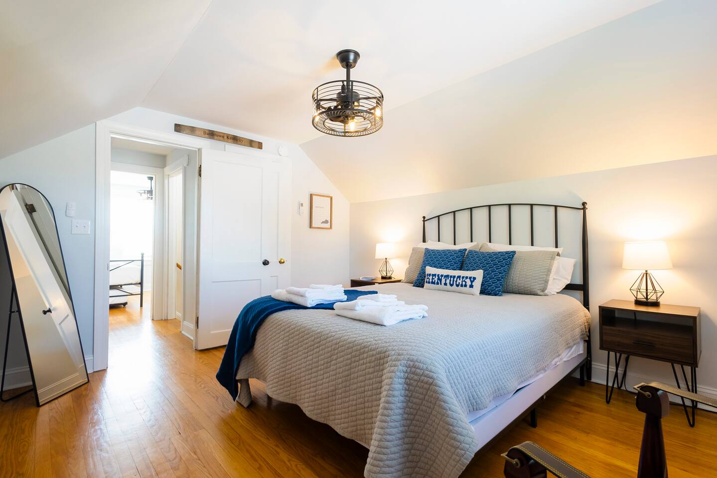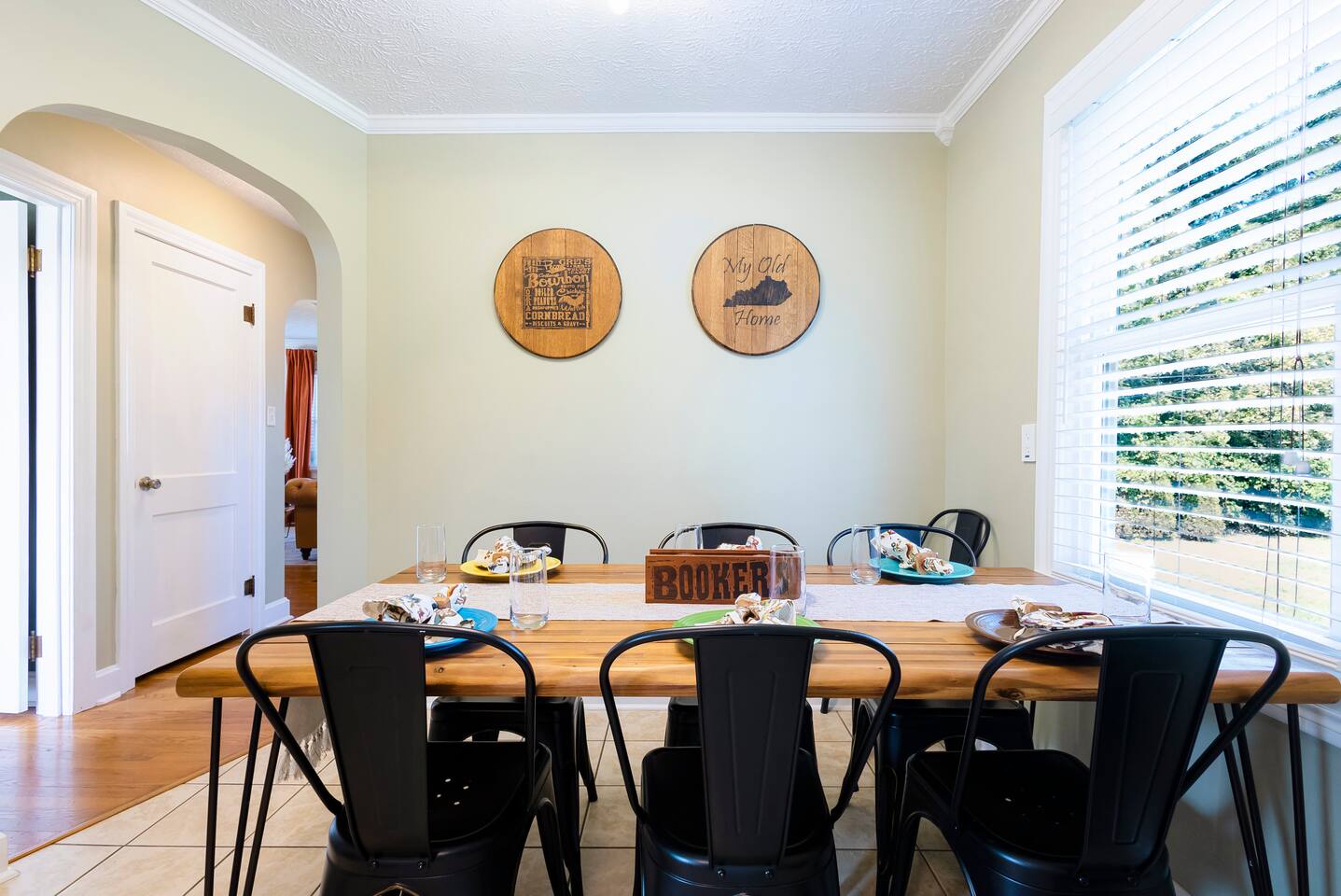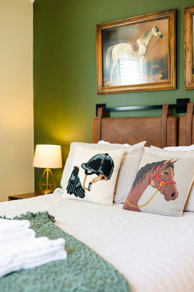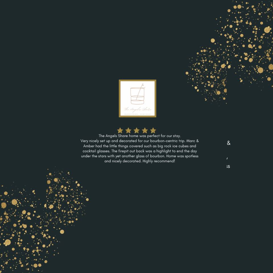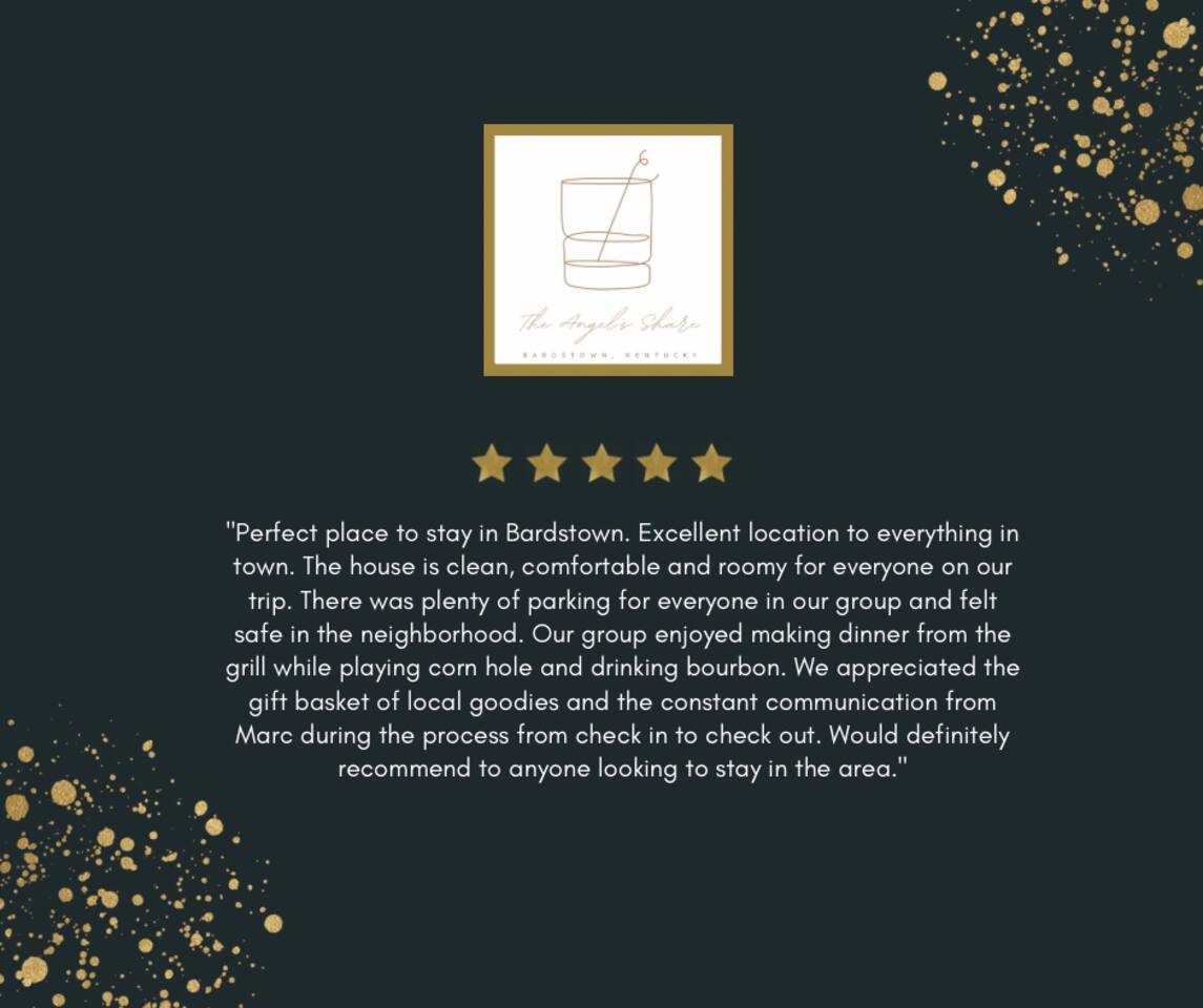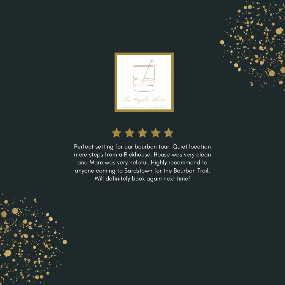 There’s a moment every morning at The Angel’s Share when the air outside smells like the inside of a barrel — warm oak, sweet grain, and something you can’t quite name. That’s the angel’s share drifting off the rickhouses at Barton 1792, right next door. It’s the only short-term rental on the Kentucky Bourbon Trail where you don’t just visit bourbon country — you wake up inside it. This 4-bedroom, 8-guest retreat sits on a quiet dead-end street just .2 miles from the 1792 distillery and less than a mile from downtown Bardstown. It’s your private basecamp for the trail — fully stocked with tasting kits, bourbon reads, a fire pit, yard games, and four named bedrooms that feel like they belong in a bourbon lover’s dream home. Come for the distilleries. Stay longer than you planned. ⎯▹ Thoroughbred Room (Bedroom 1): 1 Queen bed, ceiling fan, Roku TV, closet, USB/plug lamp ⎯▹ Bourbon Room (Bedroom 2): 1 Queen bed, ceiling fan, Roku TV, closet, USB/plug lamp ⎯▹ Kentucky Room (Bedroom 3): 1 Queen bed, ceiling fan, closet, USB/plug lamp ⎯▹ Bernheim Room (Bedroom 4): 1 Full/double daybed + 1 Twin trundle, desk, ceiling fan, USB/plug lamp • Fresh white hotel bedding + towels provided • 1 full bathroom with tub and shower • Temple Spa toiletries • Fully stocked kitchen with gadgets, crockpot, mixer, and more • Stainless cookware, Ninja blender, cocktail kit • Bourbon flight and tasting kits • LaVazza K-cups, drip maker, tea kettle, condiments • Dining area seats 8 guests • Living room w/ record player and a curated collection of bourbon trail vinyl, Roku TV + bourbon books • Gas grill + solo stove smokeless fire pit + patio dining • String Light walkway and fire pit with Adirondack chairs in backyard • Patio with Al Fresco Dining for 8 • Yard Games + Cornhole + Bucket Golf • In-home washer + dryer • Iron + ironing board • Central heat + upstairs separate HVAC units • Fast Wi-Fi • Dedicated workspace • Exterior doorbell camera Why The Angel’s Share? Because no other property puts you this close to the action. You can hear the history. You can smell the craft. And after a full day on the trail, you come home to a fire pit, a flight poured from your own tasting kit, and Adirondack chairs under string lights. This isn’t just a place to sleep between distillery tours — it’s the reason guests come back to Bardstown. • Steps from Barton 1792 distillery and rickhouse • Quiet dead-end street • Free parking for 4 vehicles on property • Backyard fire pit + outdoor games • Gas grill and patio with dining table for cookouts • Smart lock + Ring security system • Walkable to downtown + Bourbon Festival events • Custom bourbon tasting boards available and an abundance of cocktail wares Nearby Things to Do ~ Bardstown Downtown ⎯▹ 1 mile Boutiques, bourbon bars, and historic architecture Willett Distillery ⎯▹ 8 min drive Classic Bardstown distillery with on-site bar My Old Kentucky Home State Park ⎯▹ 10 min drive Tour historic mansions + picnic in the gardens Bernheim Forest ⎯▹ 15 min drive Trails, sculptures, and nature walks in a forest reserve Bourbon Festival Venue ⎯▹ Walkable in good weather! ⎯▹ 1/2 mile Home of the annual Kentucky Bourbon Festival Nearby Dining ~ Old Talbott Tavern (American) ⎯▹ 1 mile Mammy’s Kitchen (Southern) ⎯▹ 1 mile The Rickhouse Restaurant (Steakhouse) ⎯▹ 1 mile Neat Bourbon Bar (Bourbon Bar) ⎯▹ 1 mile Scout and Scholar (Brewery and Restaurant) ⎯▹ 1 mile FAQs ➤ Is parking available? Yes, free parking for up to 4 vehicles in the driveway. ➤ Are pets allowed? No pets allowed. ➤ Is the property suitable for children? Yes, but caution advised with stairs. ➤ Is smoking allowed? No smoking or vaping indoors; fines apply. ➤ Is the neighborhood quiet? Yes, on a dead-end street next to the distillery with minimal traffic. ❤️ Meet Your Host Lifelong Kentuckian, I love bourbon country and my guests who come to visit. Need anything at all? I’m just a text away! Your host, —Marc