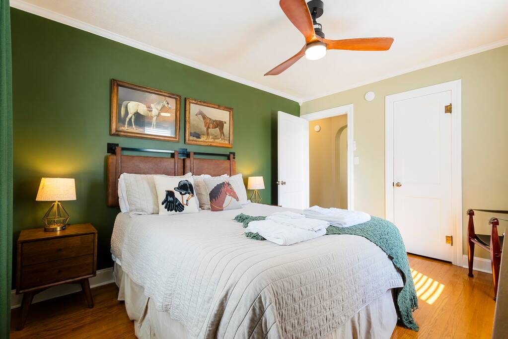 • 4 well-appointed bedrooms: ⎯▹ Thoroughbred Room (Bedroom 1): 1 Queen bed, ceiling fan, Roku TV, closet, USB/plug lamp ⎯▹ Bourbon Room (Bedroom 2): 1 Queen bed, ceiling fan, Roku TV, closet, USB/plug lamp ⎯▹ Kentucky Room (Bedroom 3): 1 Queen bed, ceiling fan, closet, USB/plug lamp ⎯▹ Bernheim Room (Bedroom 4): 1 Full/double daybed + 1 Twin trundle, desk, ceiling fan, USB/plug lamp • Fresh white bedding + towels provided • 1 full bathroom with tub and shower • Temple Spa toiletries + handmade local soaps • Fully stocked kitchen with gadgets, crockpot, mixer, and more • Stainless cookware, Ninja blender, cocktail kit • Bourbon flight and tasting kits • LaVazza K-cups, drip maker, tea kettle • Dining area seats 8 guests • Living room w/ record player and a curated collection of bourbon trail vinyl, Roku TV + bourbon books • Gas grill + solo stove smokeless fire pit + patio dining • String Light walkway and fire pit with Adirondack chairs in backyard • Patio with Al Fresco Dining for 8 • Yard Games + Cornhole + Bucket Golf • In-home washer + dryer • Iron + ironing board • Central heat + upstairs separate HVAC units • Fast Wi-Fi • Dedicated workspace • Exterior doorbell camera Experience Overview ~ • Steps from Barton 1792 distillery and rickhouse • Quiet dead-end street • Free parking for 4 vehicles on property • Backyard fire pit + outdoor games • Gas grill and patio with dining table for cookouts • Smart lock + Ring security system • Walkable to downtown + Bourbon Festival events • Custom bourbon tasting boards available and an abundance of cocktail wares Nearby Things to Do ~ Bardstown Downtown ⎯▹ 1 mile Boutiques, bourbon bars, and historic architecture Willett Distillery ⎯▹ 8 min drive Classic Bardstown distillery with on-site bar My Old Kentucky Home State Park ⎯▹ 10 min drive Tour historic mansions + picnic in the gardens Bernheim Forest ⎯▹ 15 min drive Trails, sculptures, and nature walks in a forest reserve Bourbon Festival Venue ⎯▹ Walkable in good weather! ⎯▹ 1/2 mile Home of the annual Kentucky Bourbon Festival Nearby Dining ~ Old Talbott Tavern (American) ⎯▹ 1 mile Mammy’s Kitchen (Southern) ⎯▹ 1 mile The Rickhouse Restaurant (Steakhouse) ⎯▹ 1 mile Neat Bourbon Bar (Bourbon Bar) ⎯▹ 1 mile Scout and Scholar (Brewery and Restaurant) ⎯▹ 1 mile FAQs ➤ Is parking available? Yes, free parking for up to 4 vehicles in the driveway. ➤ Are pets allowed? No pets allowed. ➤ Is the property suitable for children? Yes, but caution advised with stairs. ➤ Is smoking allowed? No smoking or vaping indoors; fines apply. ➤ Is the neighborhood quiet? Yes, on a dead-end street next to the distillery with minimal traffic. ❤️ Meet Your Host Lifelong Kentuckian, I love bourbon country and my guests who come to visit. Need anything at all? I’m just a text away! Your host, —Marc