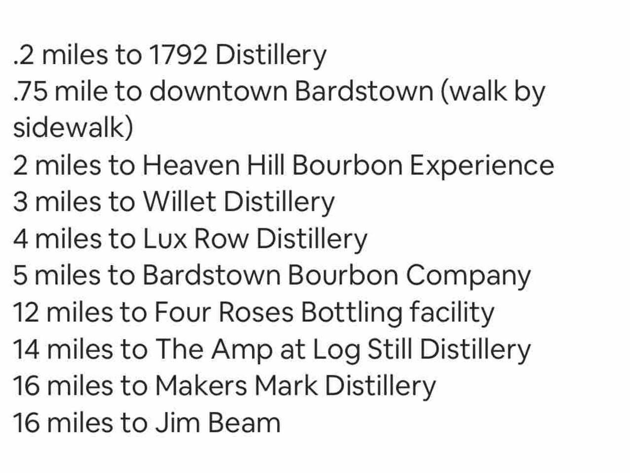 Parking is in the driveway up to 4 vehicles maximum. Absolutely no street parking or in nearby businesses or lots. If you happen to enjoy your spirits, we recommend walking to downtown areas or using the Bardstown Cab Company (Details provided in welcome binder). .2 miles to 1792 Distillery .75 mile to downtown Bardstown (walk by sidewalk) 2 miles to Heaven Hill Bourbon Experience 3 miles to Willet Distillery 4 miles to Lux Row Distillery 5 miles to Bardstown Bourbon Company 12 miles to Four Roses Bottling facility 14 miles to The Amp at Log Still Distillery 16 miles to Makers Mark Distillery 16 miles to Jim Beam